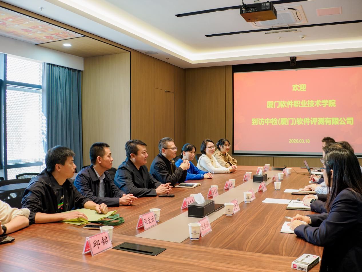 为认真贯彻落实教育部《关于深化职业教育教学关键要素改革的意见》,深入推进产教融合,精准服务厦门市“4+4+6”现代化产业体系。3月18日,厦门软件职业技术学院校长助理聂菁携教务处、学工处、软件工程学院产教融合中心、软件技术教研室相关负责人一行,赴中检(厦门)软件评测有限公司开展实地走访与校企对接。中国中检福建公司(东南区域总部)副总经理鄢华,中检(厦门)软件评测有限公司总经理王贵杰热情接洽。