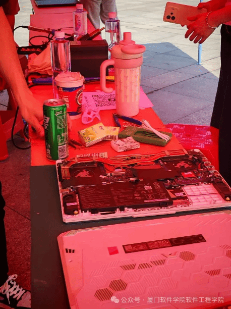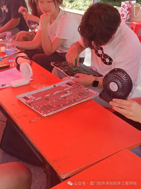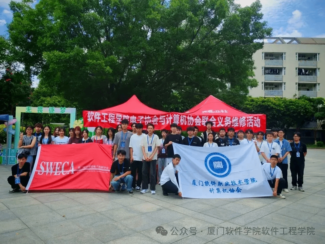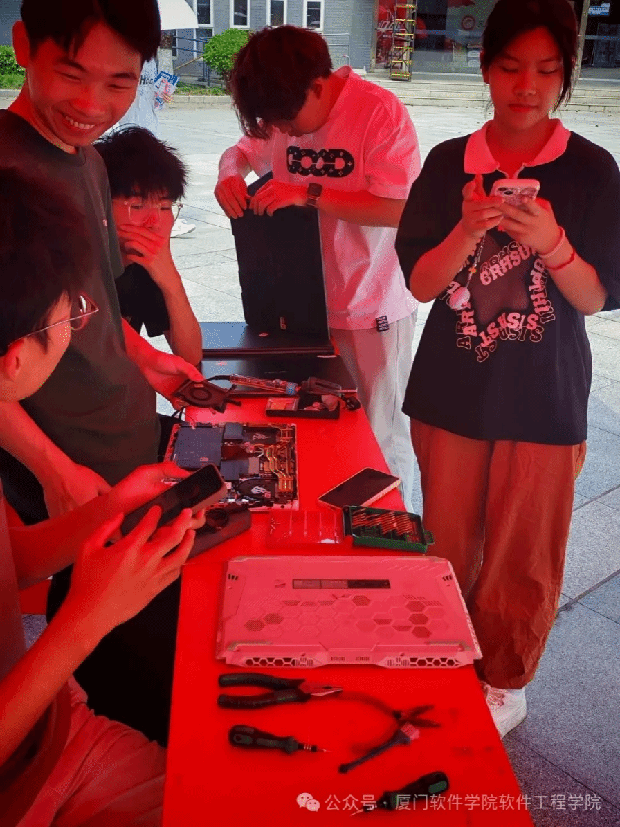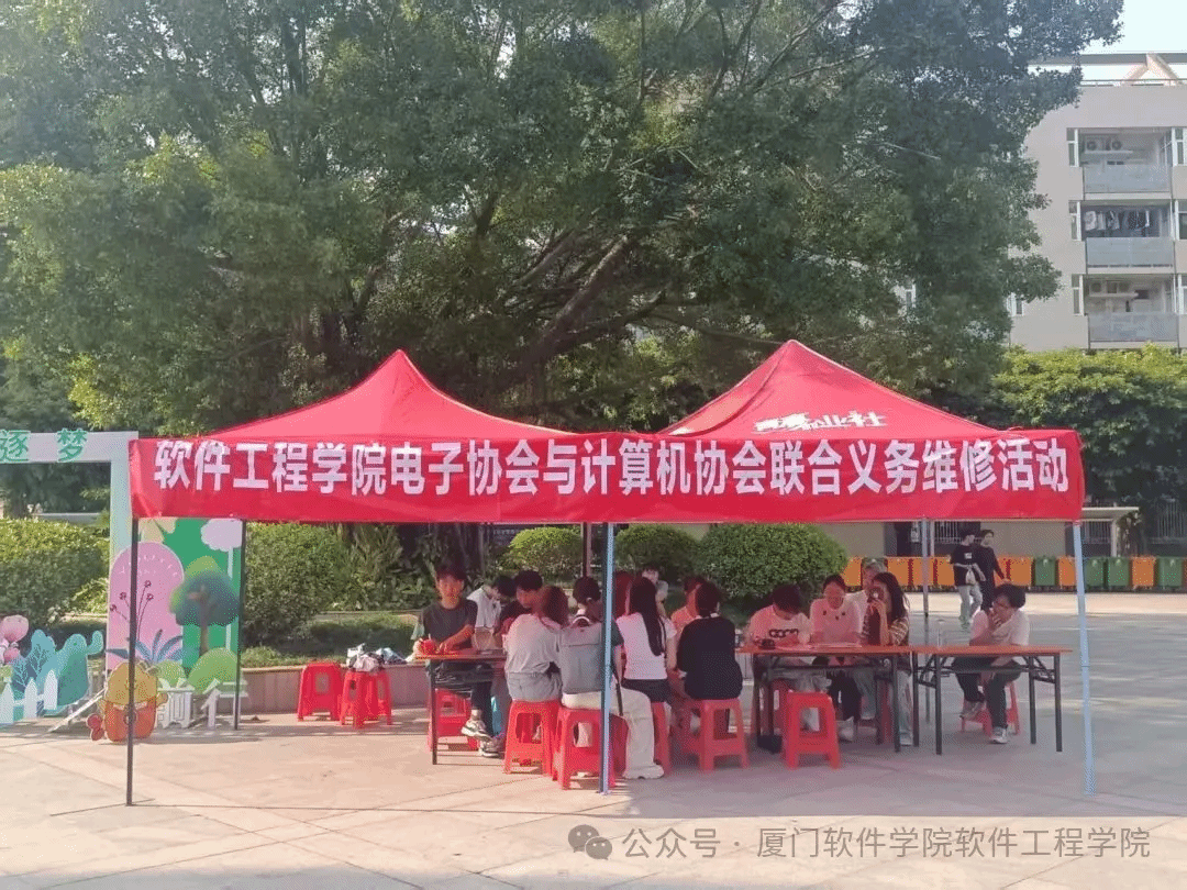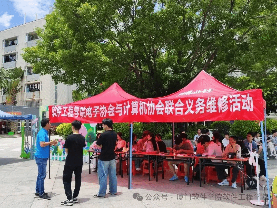 在夏日的暖风下,厦门软件职业技术学院的大榕树广场上,一群年轻人正俯身检修着各式电子设备。这是由软件工程学院党总支指导,计算机协会与电子协会联合举办的义务维修活动现场。